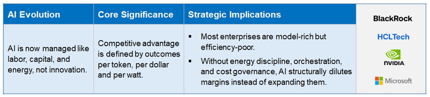 - The race is no longer for the smartest model, but for the cheapest, fastest conversion of compute into outcomes – AI is now a Production Input; not a Differentiating Feature