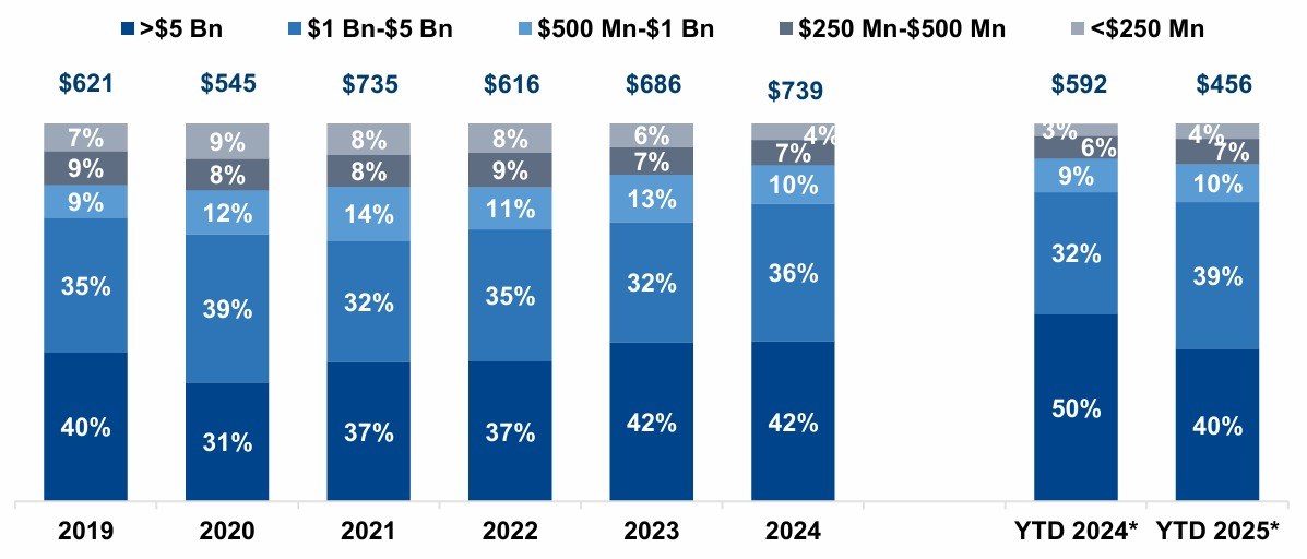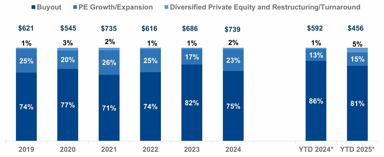 In YTD 2025, supported by favorable valuations, operational flexibility, and stable earnings, fundraising through small funds increased by 17.3% year on year, enabling faster deal closures despite broader market caution. Funds such as One Equity Partners IX and Great Hill Equity Partners IX were among the key contributors to this growth.