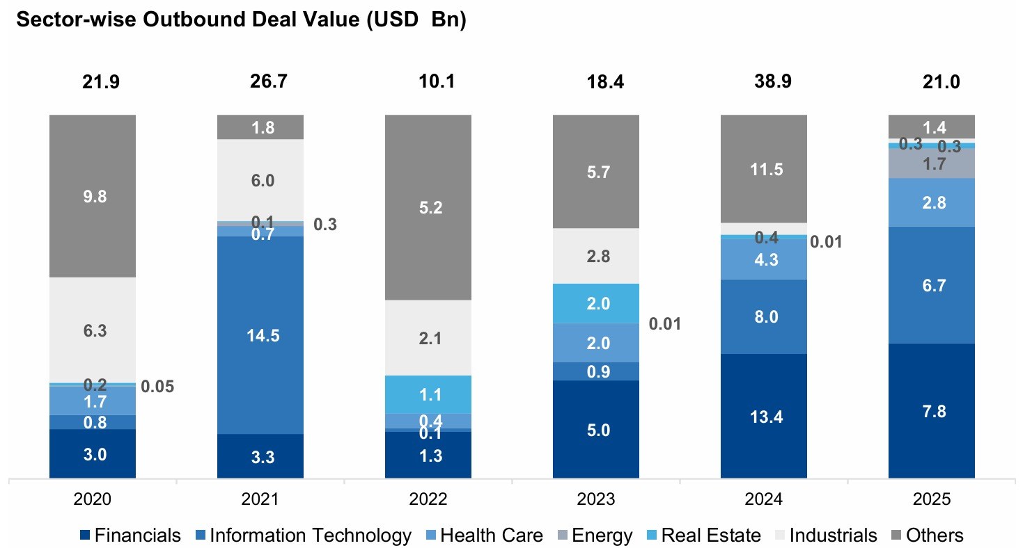 - Financial Services: This sector became overwhelmingly dominant in 2024, contributing USD 13.4 Bn, and remained the leader in 2025 with USD 7.8 Bn. This spike suggests that aggregate value is now driven by large transactions in banking, insurance, and asset management platforms.