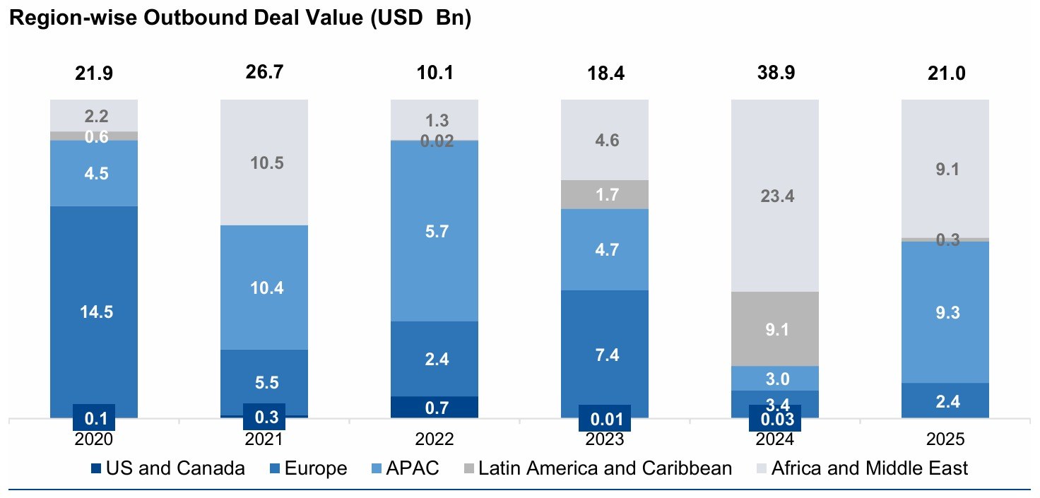 - Asia-Pacific (APAC): Conversely, deal value in APAC has moderated. From over USD 14 Bn in 2020, value fell to USD 2.4 Bn in 2025. While deal counts remained stable due to supply chain linkages, the region is currently attracting less capital from Japan for large-scale platform M&A compared to the West.