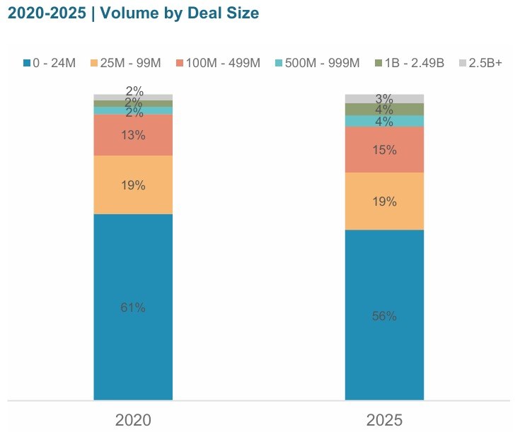 The deal-size mix in 2025 shows M&A activity remains skewed toward smaller transactions, but with a clear shift toward mid-to-large deals compared to 2020. Sub-$25M deals still dominate, but their share declined from 61% in 2020 to 56% in 2025, indicating that market activity is becoming less reliant on very small-ticket transactions. Meanwhile, the $25M–$99M segment held steady at 19%, suggesting a consistent appetite for lower mid-market deals despite broader macro volatility.