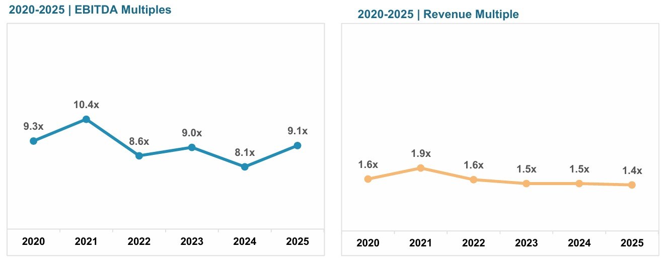 Valuations across 2020–2025 show a clear “peak-and-reset” pattern, with multiples expanding into 2021 and compressing as market conditions normalized. EBITDA multiples peaked at 10.4x in 2021, dropping through 2022–2024 and recovering modestly to 9.1x in 2025. This trajectory is consistent with the broader shift from liquidity-driven pricing to a more fundamentals-led environment, where buyers have been disciplined on entry valuations.