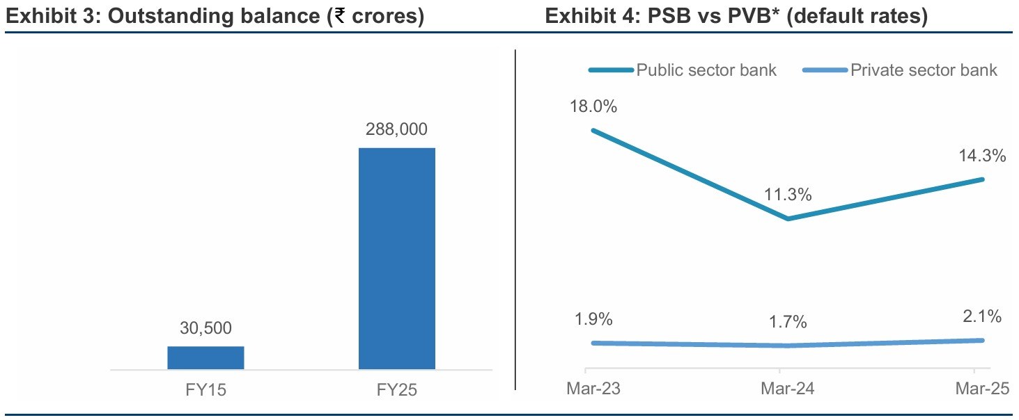 - Portfolio Scrubbing: Lenders such as SBI Card and RBL Bank have actively slowed growth to clean up their books, leading to a moderation in outstanding growth (projected at 10-12% for FY26 vs >20% in FY23 and FY24).