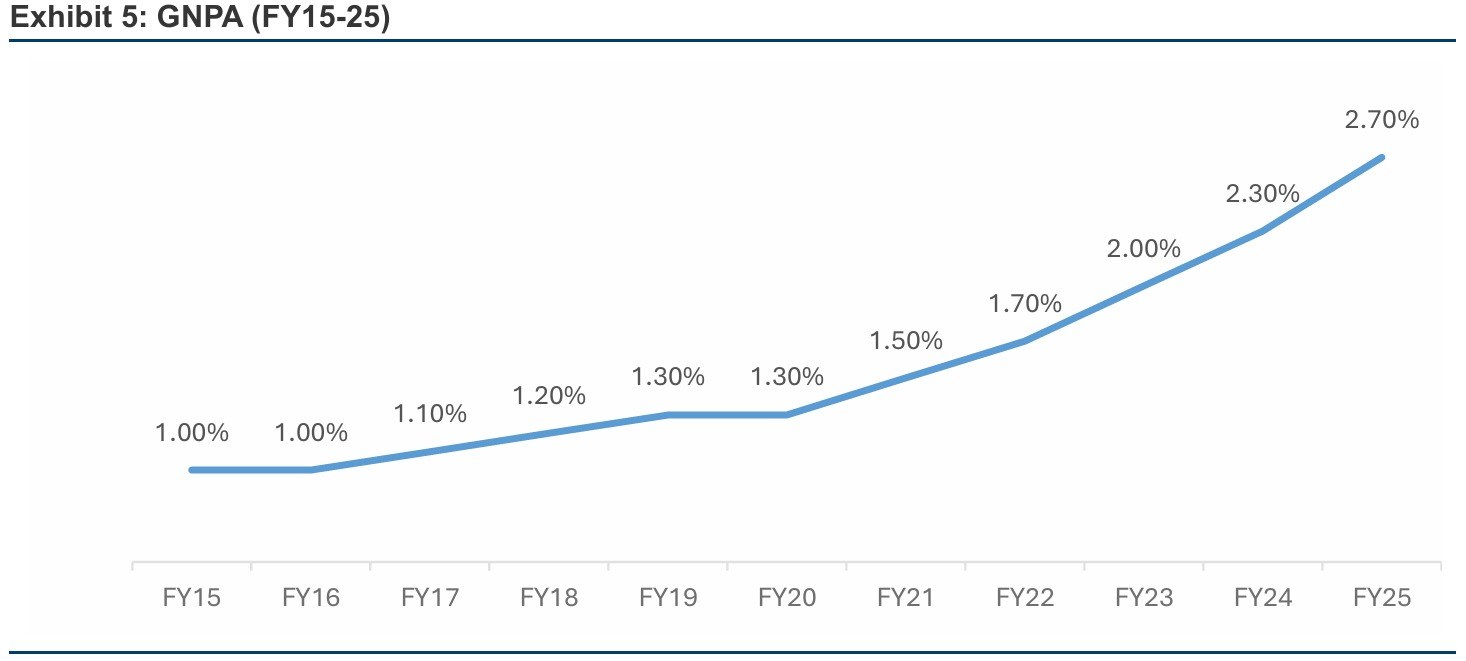 Entering 2025, the GNPA ratio remained near 2.3%, though CRIF Highmark data implies deeper distress, showing a 15% default rate and a 44% YoY surge (vs FY24) in the 91–360-day overdue bucket to ₹33,886 crore. The GNPA ratio climbed from 1.84% in FY24 to 2.3% in FY25, with some reports indicating that overall loan defaults (including small-ticket loans) reached 3.6% in FY25.