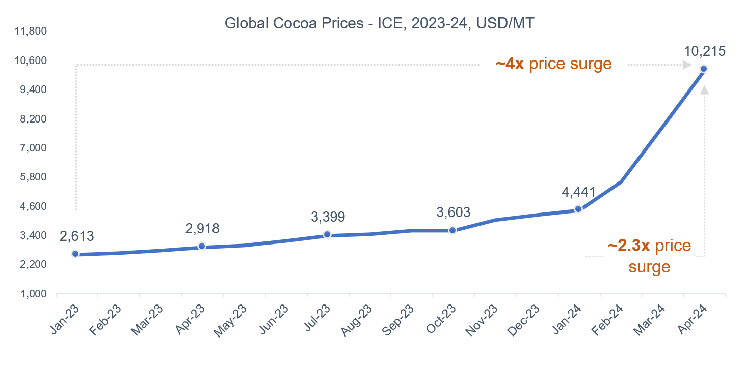 Despite global supply challenges, the results for cocoa grinding across North American, European, and Asian regions were better than anticipated. North America, in particular, recorded a 3β4% increase in grinding volumes, contrary to expected declines. This strong performance highlights robust demand and indicates increased pressure on the already limited cocoa supplies. Reflecting this demand, cocoa prices surged, hitting USD 10,000+/MT in May 2024.