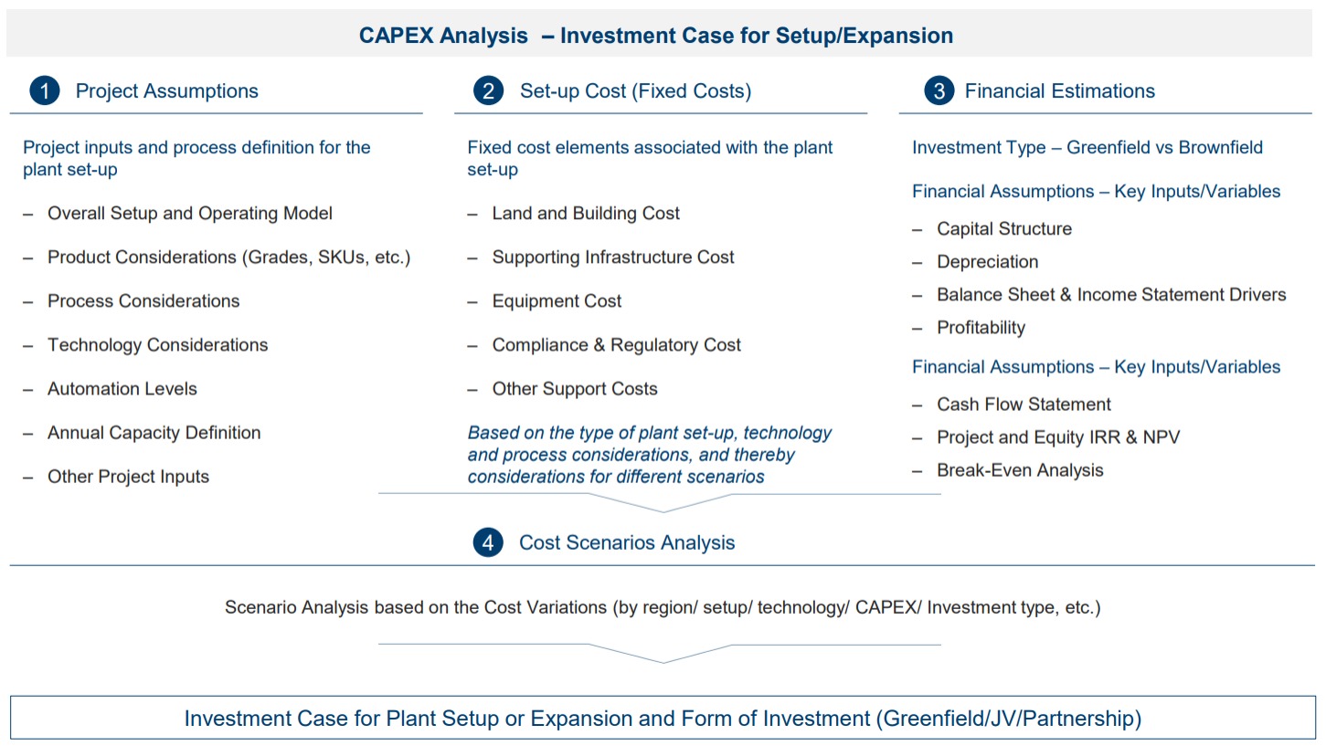 Whether you are considering a new plant investment (greenfield or brownfield) or looking into backward integration within existing facilities, our comprehensive CAPEX analysis has you covered. Our solution framework includes plant setup, layout/design, equipment and technology integration, regulatory requirements, depreciation, financial considerations, risk assessment, and potential pitfalls. Clients benefit from our thorough CAPEX modeling, which encompasses investment recommendations, returns, financial estimates (NPV, IRR, ROI, breakeven/payback, profitability), and early warning signs of risks.