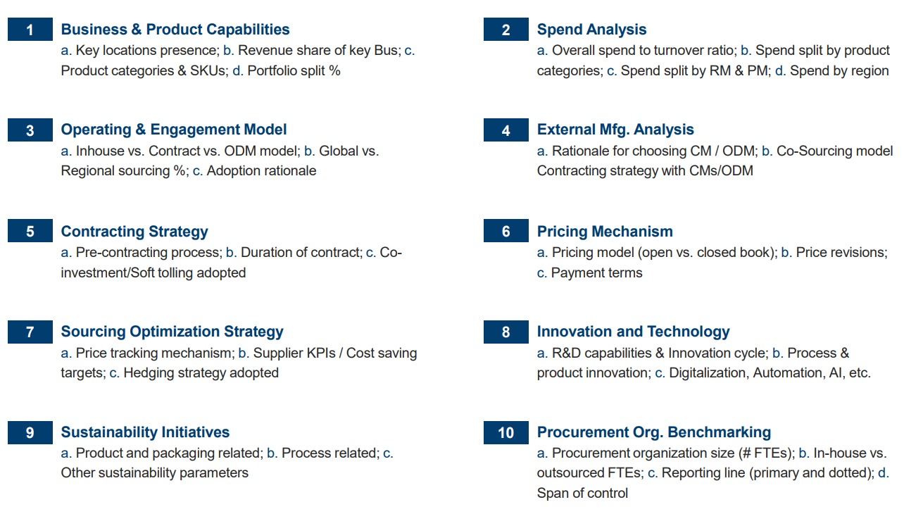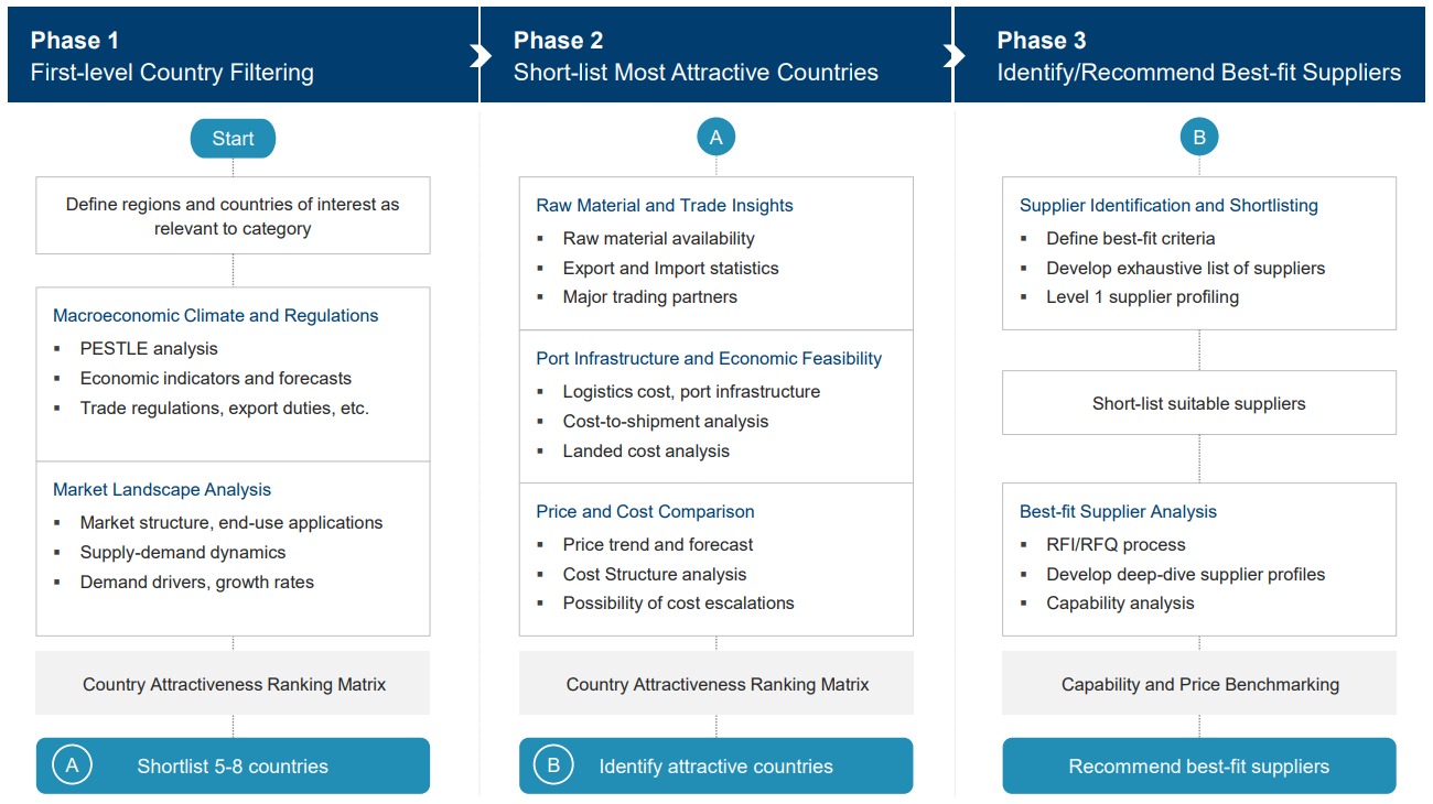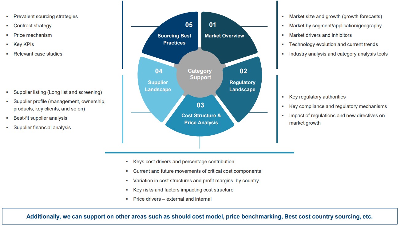 Our comprehensive offerings include supplier identification and benchmarking, cost optimization through best-cost and low-cost country sourcing, should-cost modeling, and category best practices assessments. Further, we deliver actionable insights through price intelligence and forecasting, supply chain risk assessments, supplier risk analysis, green sourcing, CAPEX analysis, spend analytics, and category 360 overviews to ensure end-to-end strategic support.