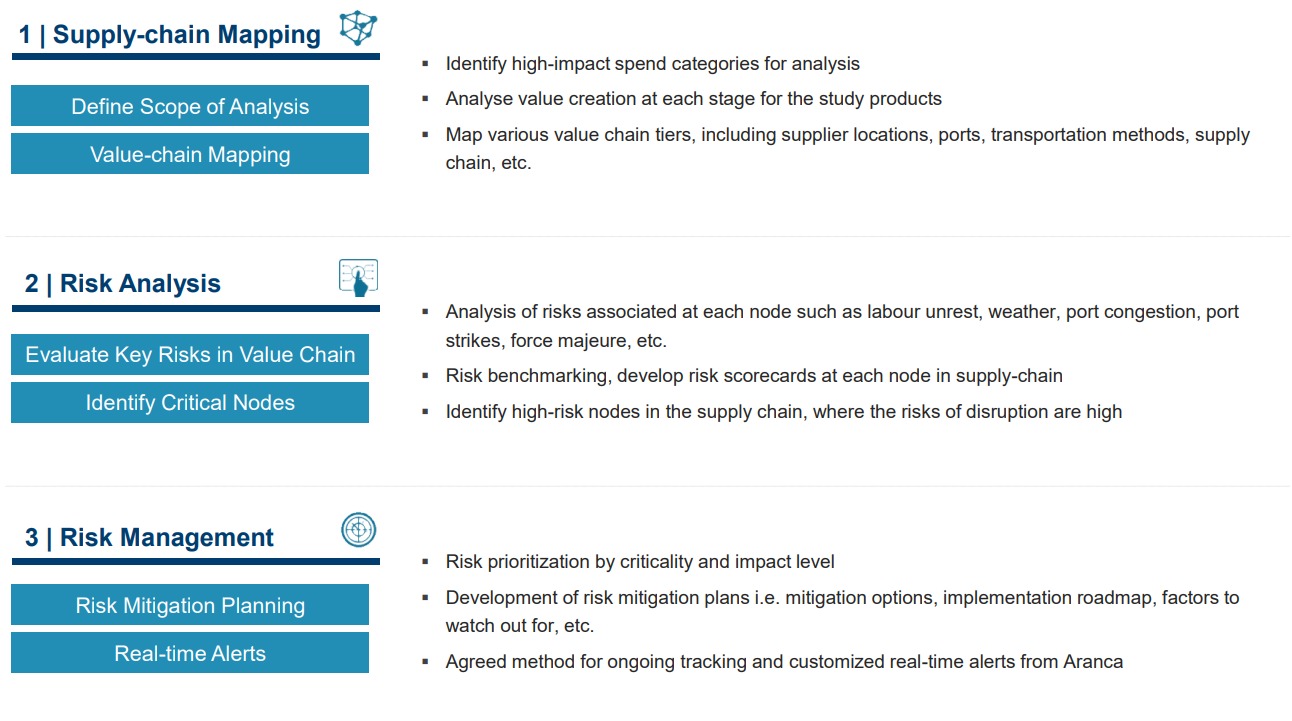 Our risk analysis evaluates potential threats at each tier, by analyzing supply-demand dynamics, geopolitical conditions, macroeconomic trends, cost fluctuations, and force majeure events. We benchmark these risks, create risk scorecards, and identify high-risk nodes prone to disruption. Our risk management approach prioritizes risks by criticality, develops mitigation plans with implementation roadmaps, and offers ongoing tracking with customized real-time alerts and risk mitigation strategies.
